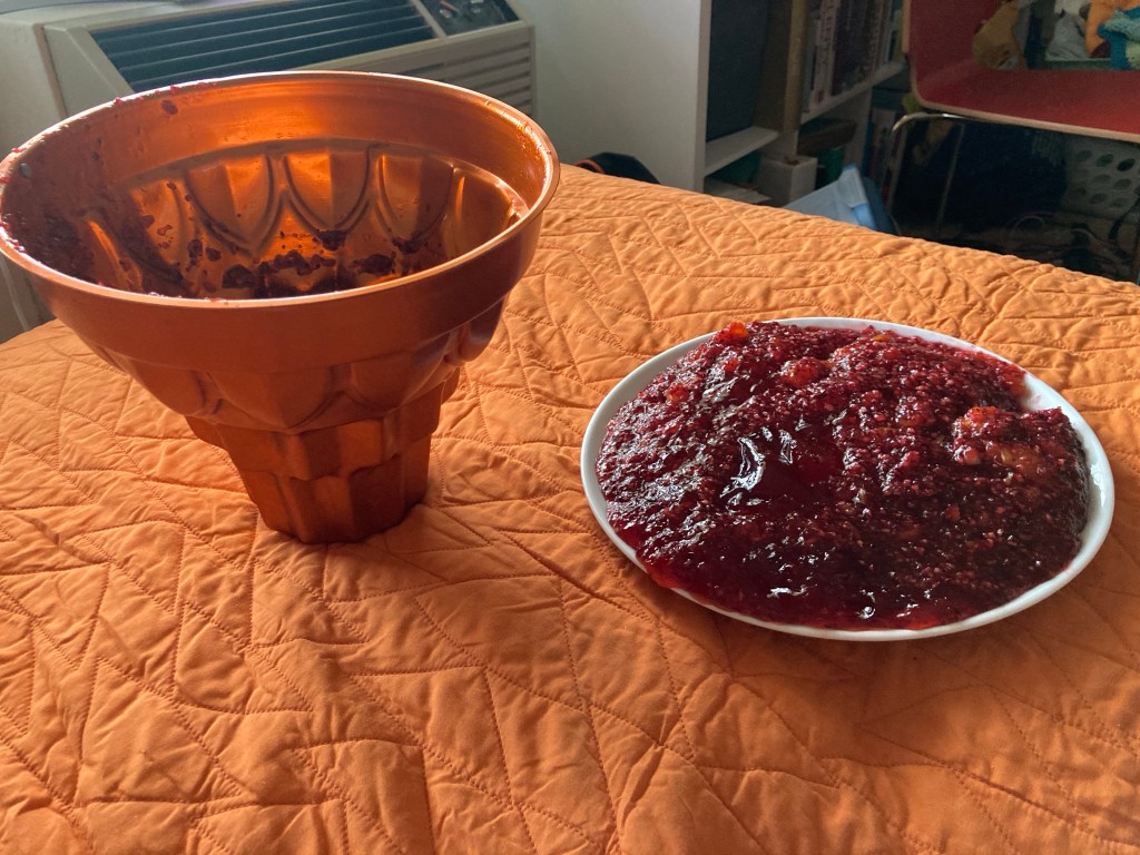 I ordered broasted chicken and mashed potatoes from a local restaurant. I used a generic stove top stuffing box. As expected it was meh. My family also makes an orange cranberry jello. I ended up making it on Friday. I wanted to use this fancy mold I found at Goodwill. I apparently didn’t let it set up enough, but it still tastes really good!