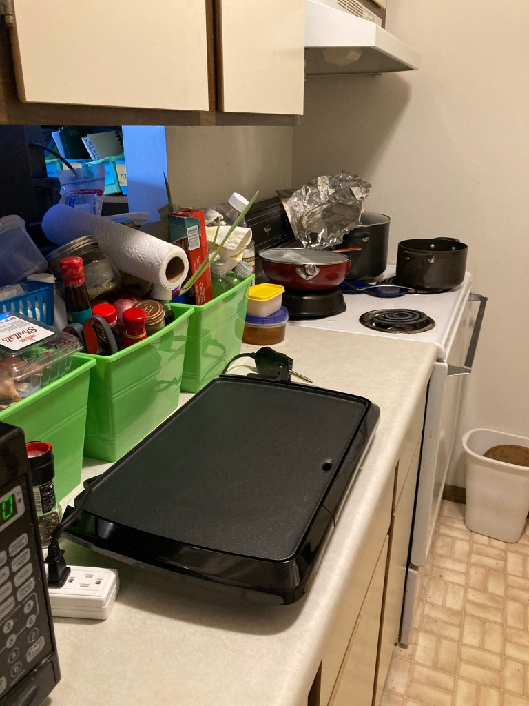 I am going to save Saturday for last and talk about today for a second. I have a hate/hate relationship with my stove. There are some things I can do, but anything to be made in a shallow pan is a pain. I hate Black Friday, but I had to go grocery shopping anyway and I usually do so at Meijer. The one I go to doesn’t get overrun with crazy people so I was able to get a $30 griddle for $20. Figure I can cook pancakes, eggs, bacon, whatever else on the griddle and not curse like a sailor. This morning I made pancakes and am super happy with it. Yes, my kitchen is small, crowded, and a hot mess!