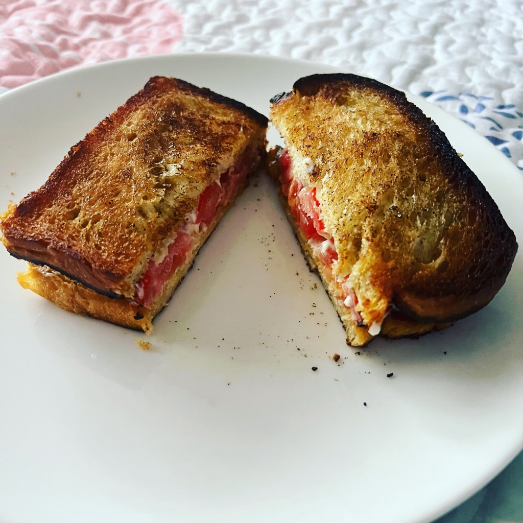 The curried tomato sandwich was super easy. You are basically toasting bread on the stove top in oil and curry spice. Then you make your tomato sandwich as usual. I did like the recipe and just used mayo and tomatoes, but it would be good with additions like lettuce, bacon, or avocado. However you like your sandwich. You can also use your favorite spice if curry isn’t your thing.