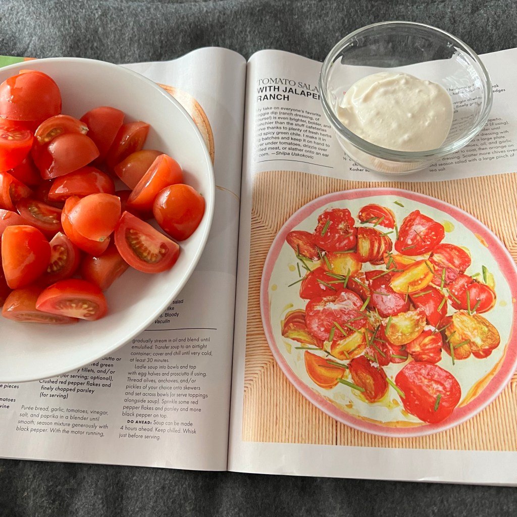 One might argue I did not make the tomato salad with jalapeño ranch. I didn’t use jalapeño and I didn’t have any chives. I forgot to add them to the shopping list. So I added more onion spices. I also didn’t rub the tomatoes with oil and garlic. I am sure that is delicious, but I like tomatoes as is too. I used the ranch as a dip. To be honest I think it is kind of weird to throw them on top. It is really good. Maybe next time I will make it more proper, but still leaving out the jalapeño.
